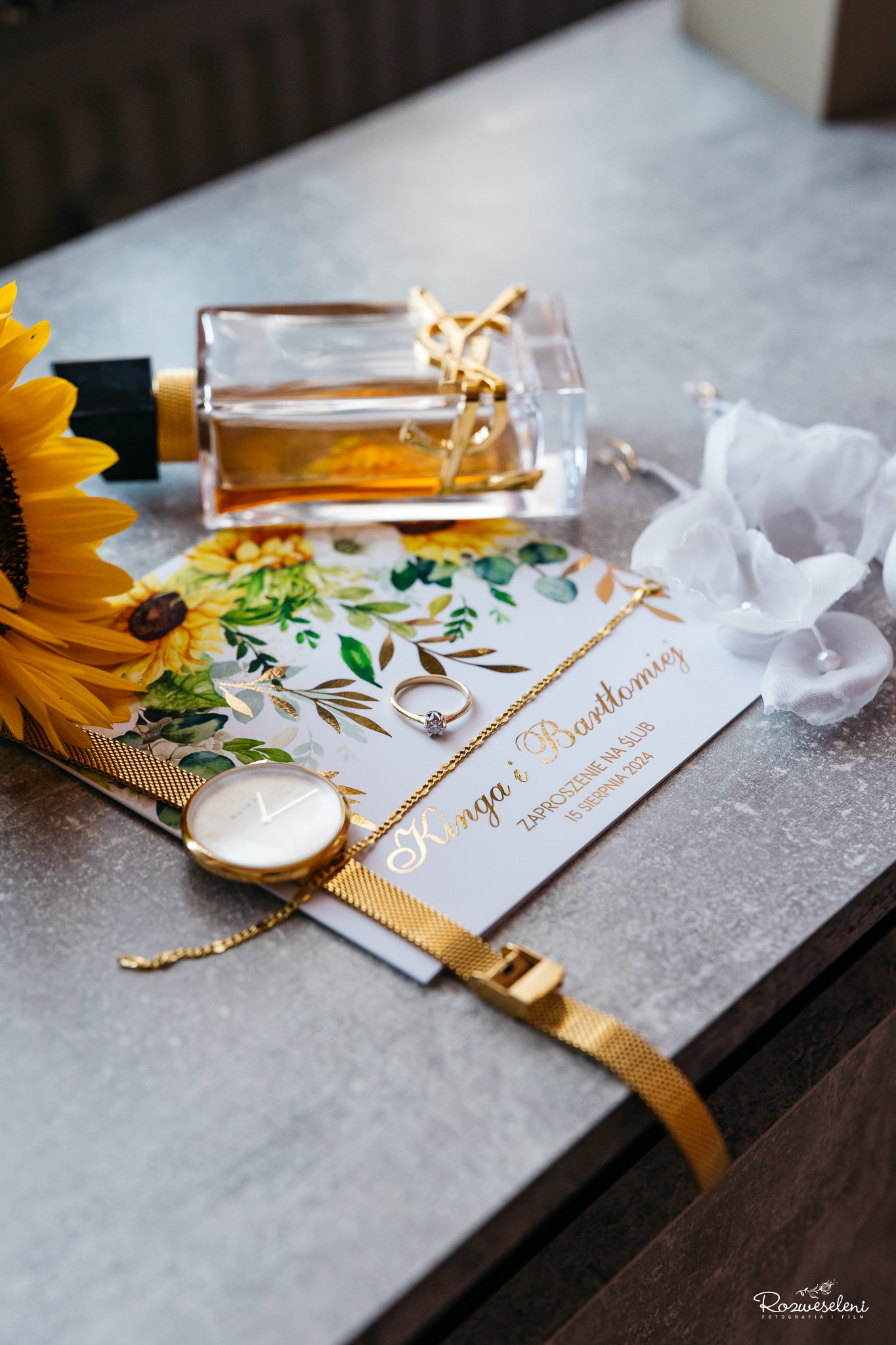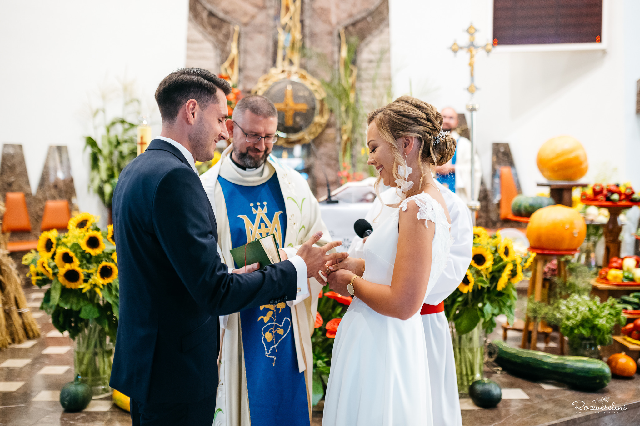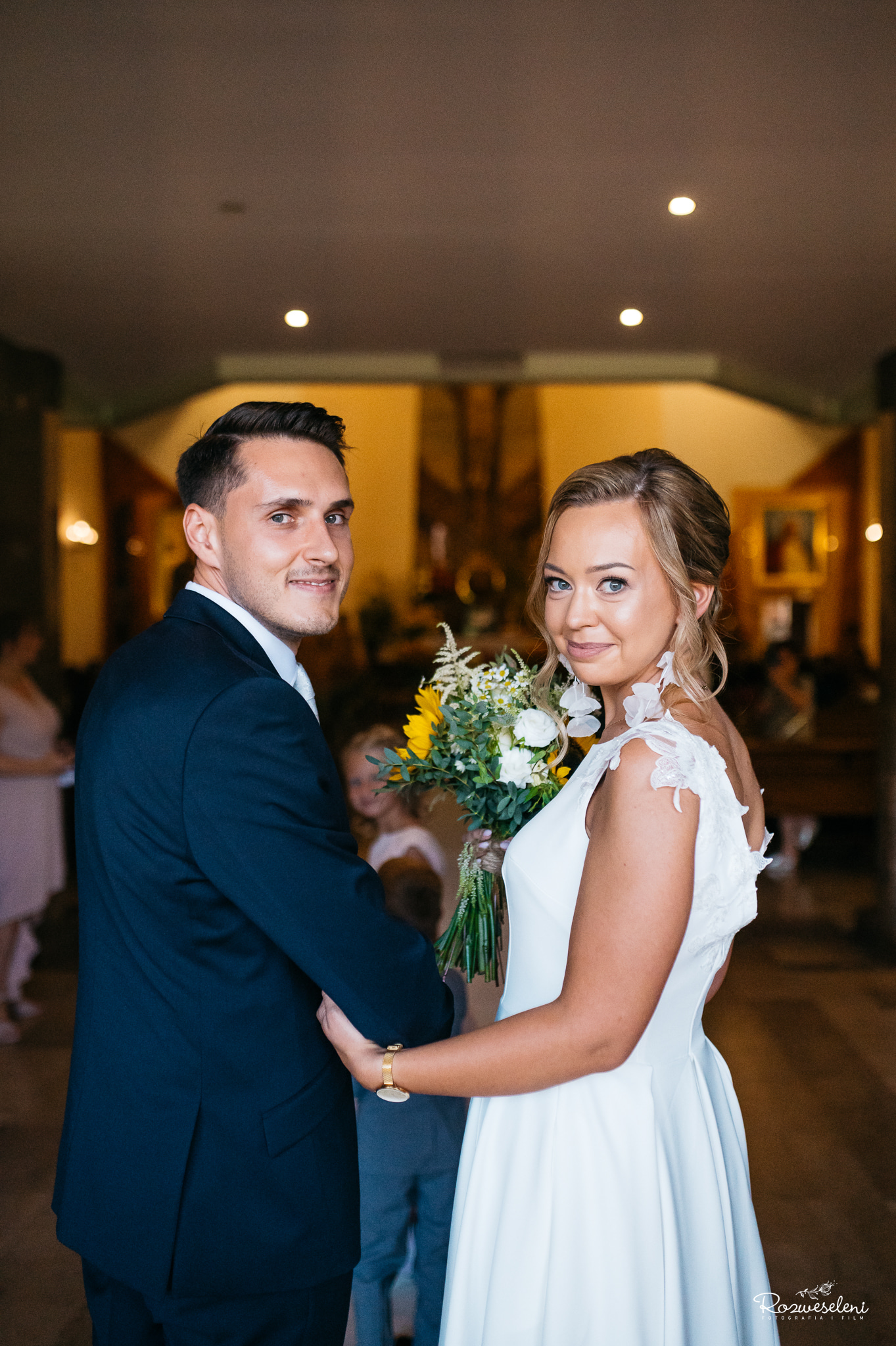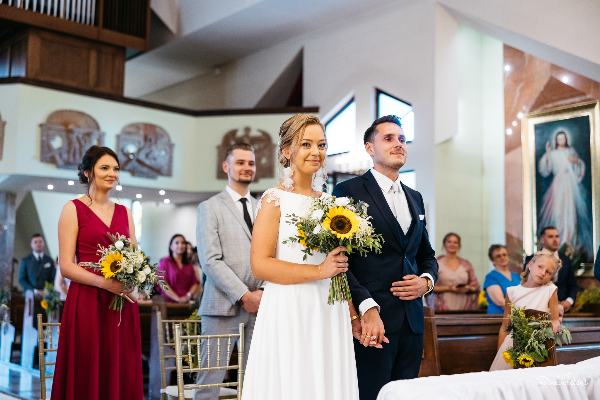 Zaczęło się od sesji narzeczeńskiej – trochę nieśmiałości, trochę wątpliwości („my? przed obiektywem?”), ale… wystarczyło kilka chwil, żeby pokazać, jak pięknie potrafią być sobą. Kinga i Bartłomiej to duet stworzony do zdjęć – naturalni, zakochani po uszy i… słoneczni! Bo właśnie słoneczniki królowały tego dnia – na zaproszeniach, stołach, a nawet w bukiecie Panny Młodej!